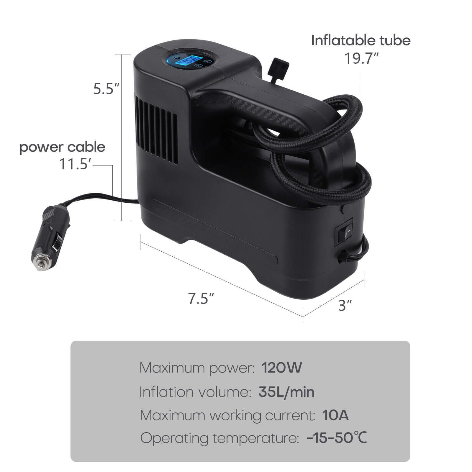 Simply plug DC 12V car cigarette connector into the 12V power outlet in your car and attach the hose to the tire, set the tire pressure value, and then press the switch, it will start to inflate.