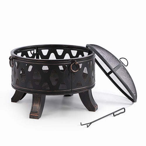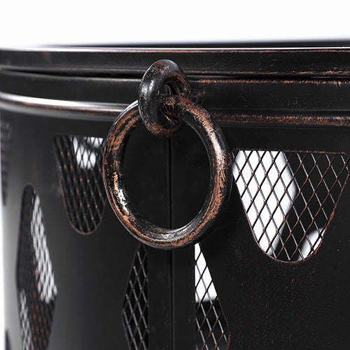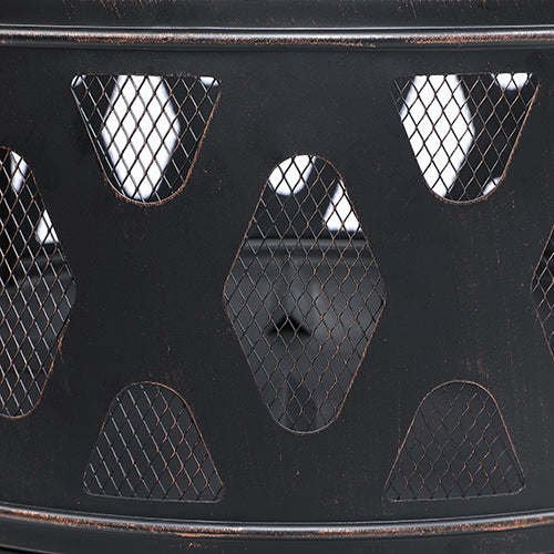 Spark Screen Included Weather Resistant Fuel Type Wood Description Gather around with your family and friends and keep warm during the winter with this firepit. This rustic-inspired fire pit features a rich, oil-rubbed bronze finish, bold cross-weave design and decorative rings definitely makes an impression and is perfect for entertaining on your backyard patio. This fire pit has ample space for plenty of firewood and includes a mesh lid and poker to complete your setup.