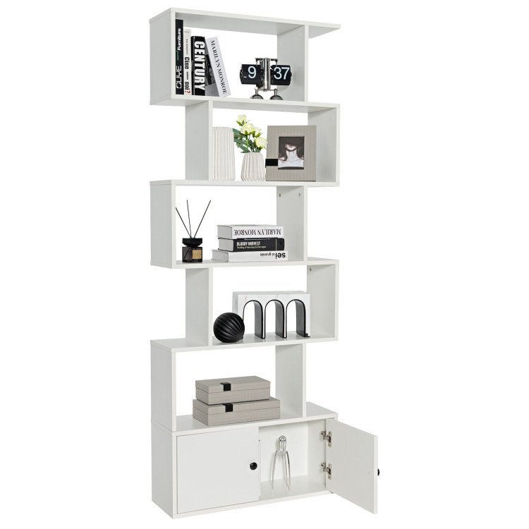 Designed in an S-shaped geometric style to be a great decoration in your spaceAmple storage space with a 5-tier open shelf and a closed cabinetMade of E0 grade engineered wood and high-quality MDFA waterproof surface makes cleaning effortlessEquipped with anti-toppling devices to add extra safetyNon-slip foot pads also protect your floor from scratchingEasy and quick to assemble with instructionsSuitable for various places; such as bedrooms; living rooms and home office