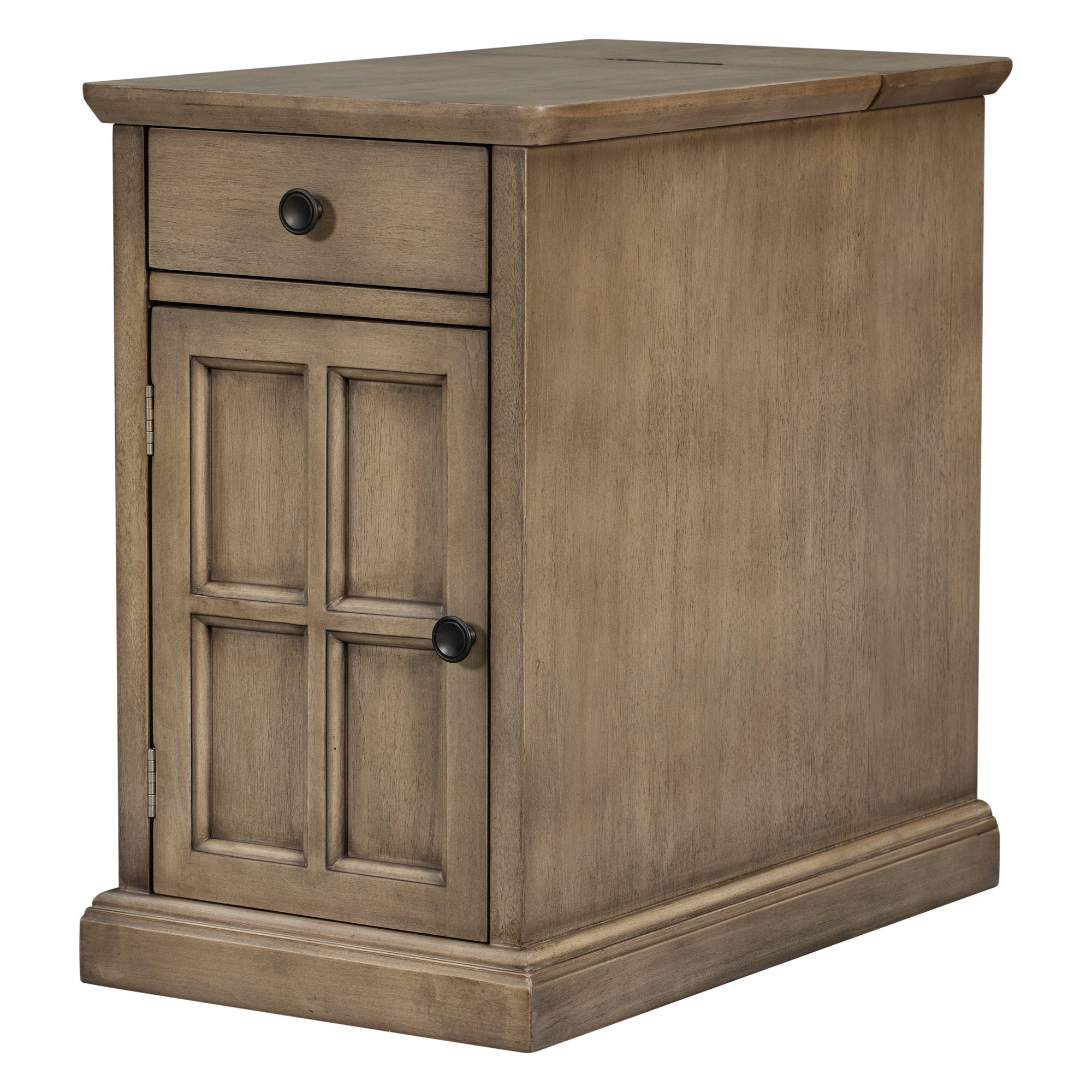Every sofa's sidekick, end tables display decor, hold TV remotes and beverages, and round out seating ensembles in style. Take this one for example: Equipped with a hidden pull-out tray, this table makes it easy to safely set drinks down with the built-in cup-holders. A discreetly situated USB outlet provides easy access to charge your devices. Choose to stash away snacks, books, magazines, or remotes inside the long storage cabinet on either of the interior shelves.