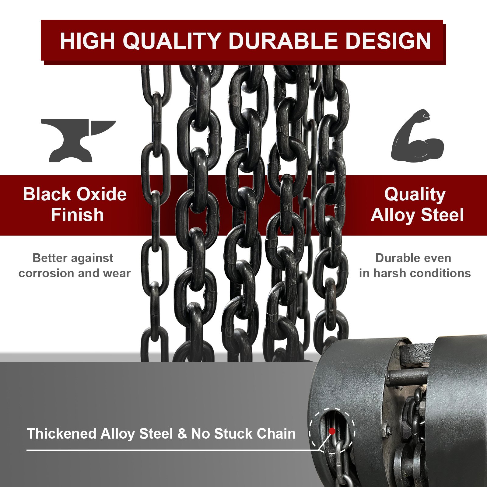 [SAFETY & STABILITY]- Built to meet ASME B30.16 Overhead Hoist Safety Standards. The chain blocks are equipped with a heavy-duty steel hook featuring a security latch. Moreover, it can rotate full 360° without twisting and bending, guaranteed to operate smoothly and minimize manual effort.