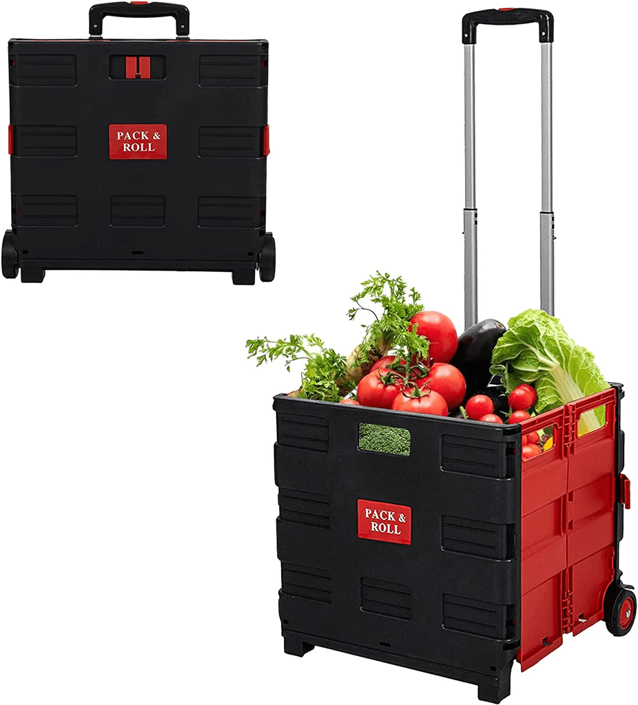 1.This pack and roll folding shopping and utility crate is a portable unit that folds flat into a compact case for convenient storage. Features smooth-rolling wheels for easy mobility. Use in the workplace, at the shops or for home projects. Ideal for school, grocery, fishing, tailgating, office, moving, shopping, laundry, travel or as a toolbox. Smooth-rolling wheels. Portable unit unfolds and sets up in seconds. Telescopic, aluminum handle with a contoured plastic grip for comfort.
