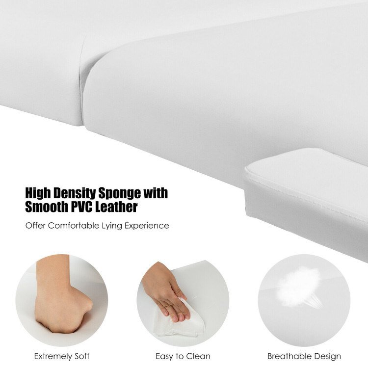 Adjustable height to fit therapists of different heightsFoldable and portable design for easy transportation and storageComfortable lying experience thanks to its high-density sponge and PVC leatherHold up to 441 lbs because of reinforced beech frame with support steel cablesIncluded headrest, armrests and hand pallet provide extra comfortSuitable for spa, massage, facial care, tattoo and foot massage, etcEasy installation with detailed instruction