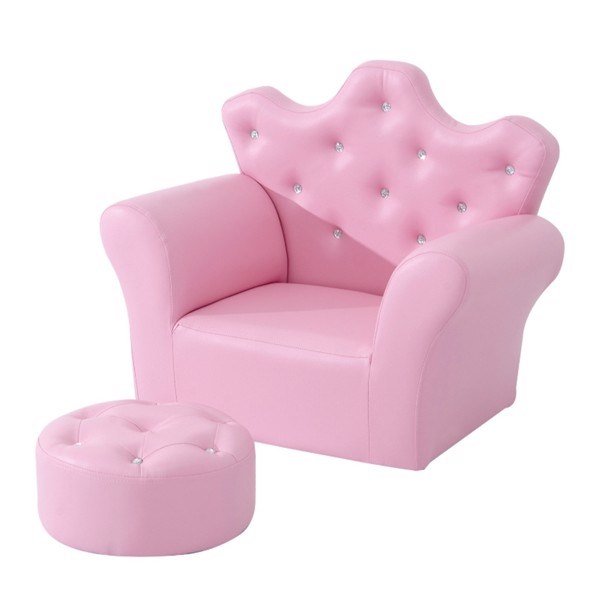 • - The crown-shaped backrest and bright crystal buttons on the chair and footstool are sure to make your kid's eyes light up